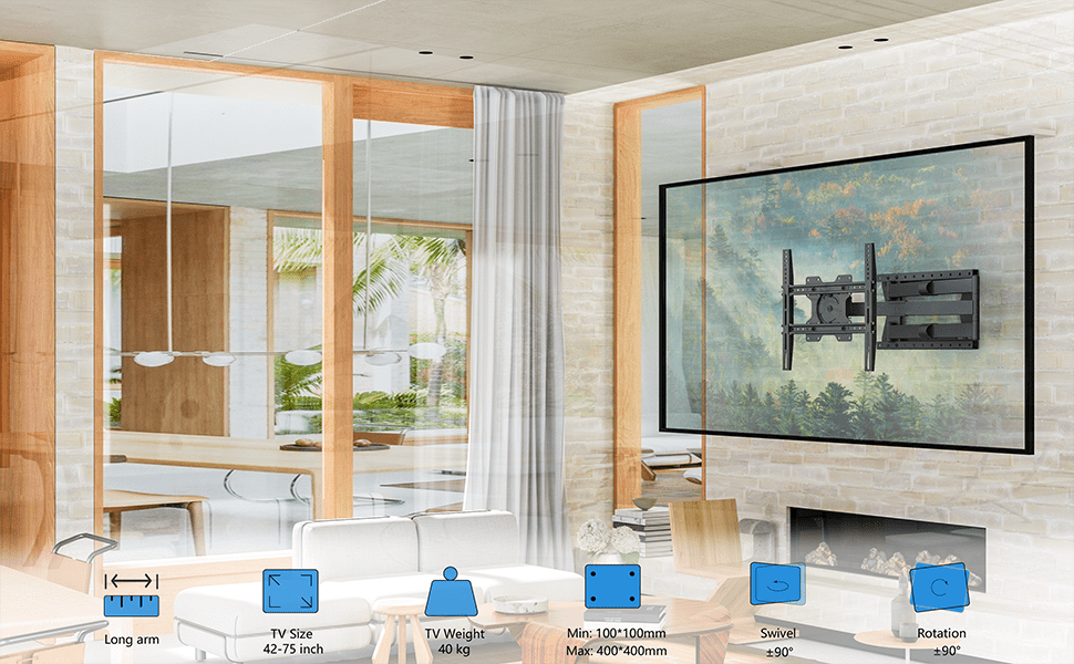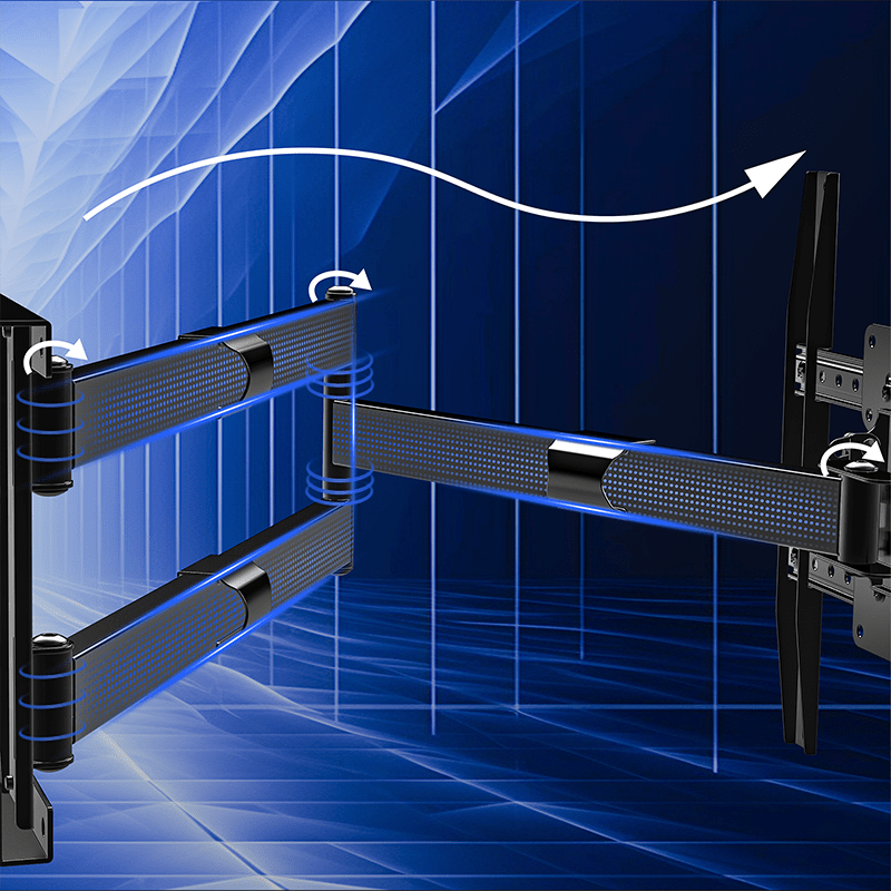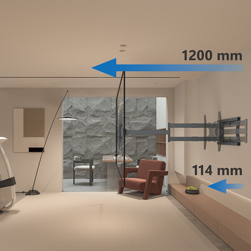 - Extreem groot bereik: Met een maximale afstand van 120 cm tot de muur kun je zelfs de grootste televisies 90 graden (volledig haaks) op de muur draaien.