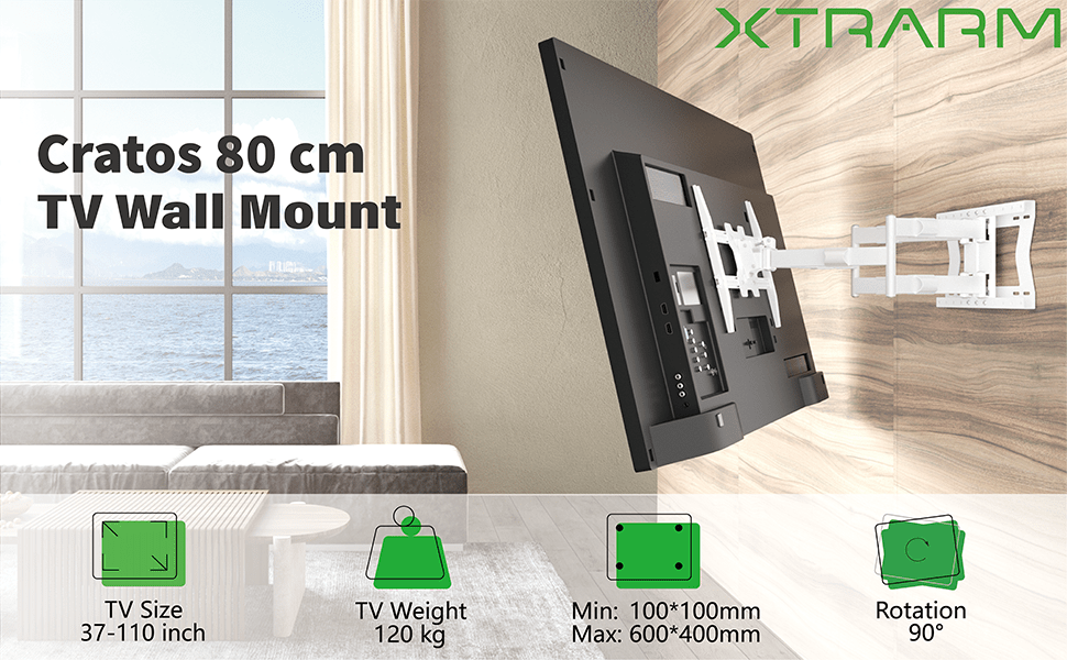 Zoek je een uiterst betrouwbare muurbeugel die een aanzienlijk bereik combineert met de hoogst mogelijke stabiliteit? De witte XTRARM Cratos 80 cm Double Rotate is specifiek ontwikkeld voor de grootste en zwaarste schermen van dit moment. Met ondersteuning voor televisies van 52 tot maar liefst 110 inch en een indrukwekkend draagvermogen van 80 kg, is dit de meest solide oplossing voor jouw thuisbioscoop.