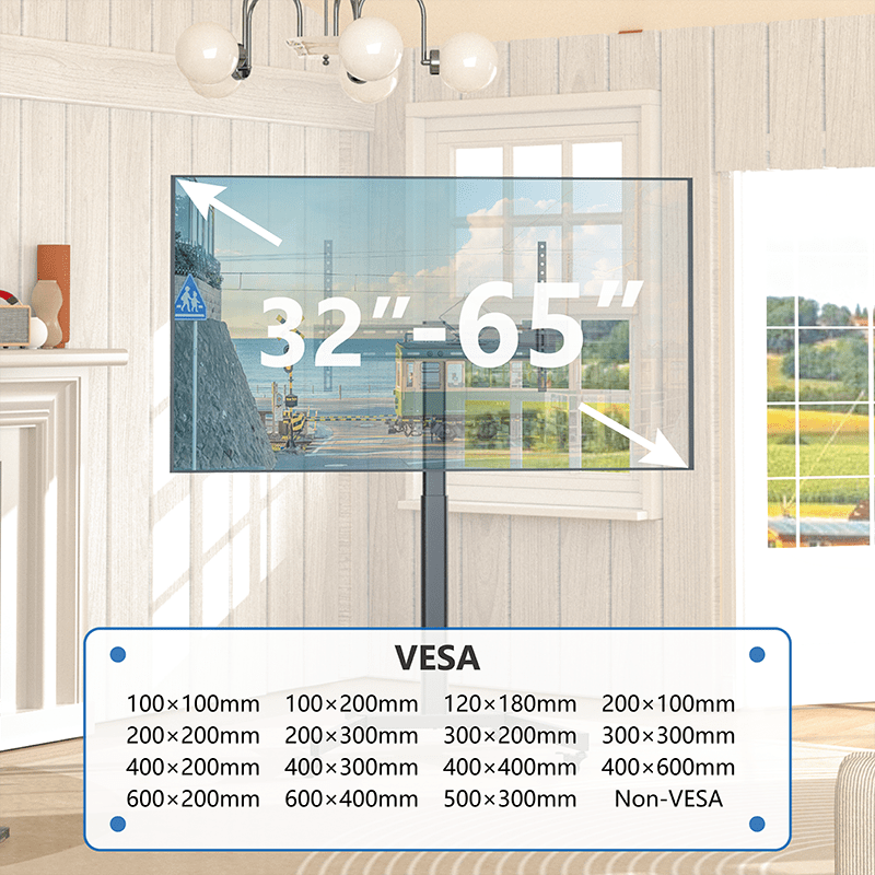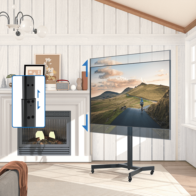 - Moeiteloze mobiliteit: Dankzij de soepele zwenkwielen verplaats je de tv eenvoudig tussen verschillende ruimtes. Twee wielen zijn voorzien van een rem voor maximale stabiliteit tijdens gebruik.