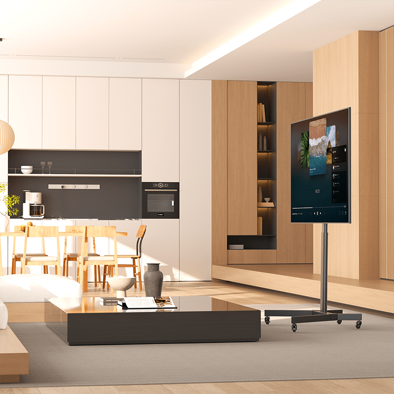- Instelbare kijkhoogte: Stem de hoogte van de standaard (tussen 137,3 en 145,3 cm) precies af op jouw zithoogte of de gewenste presentatiehoogte.