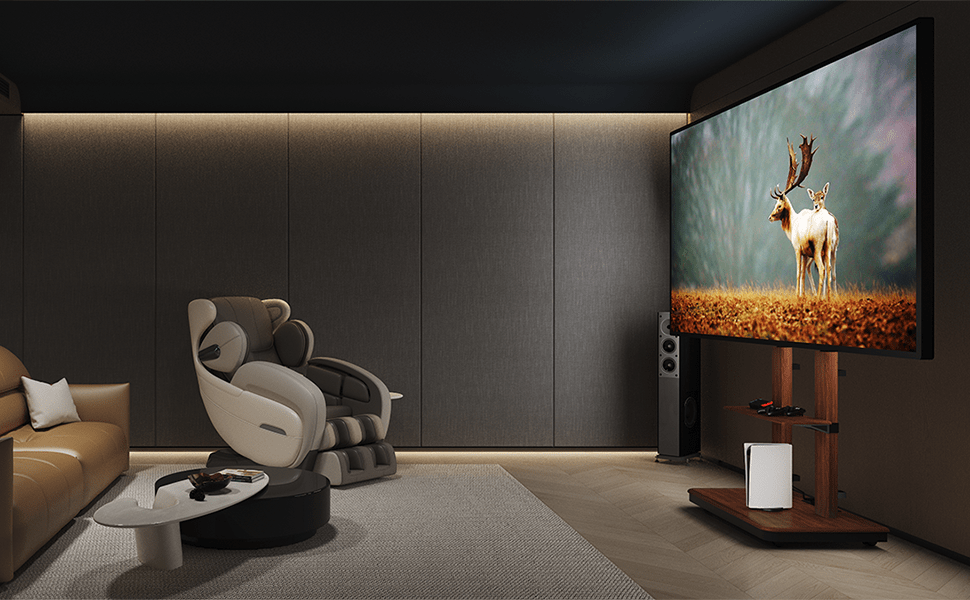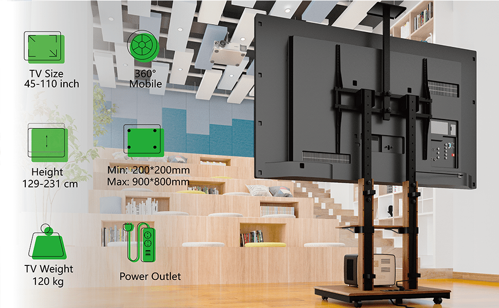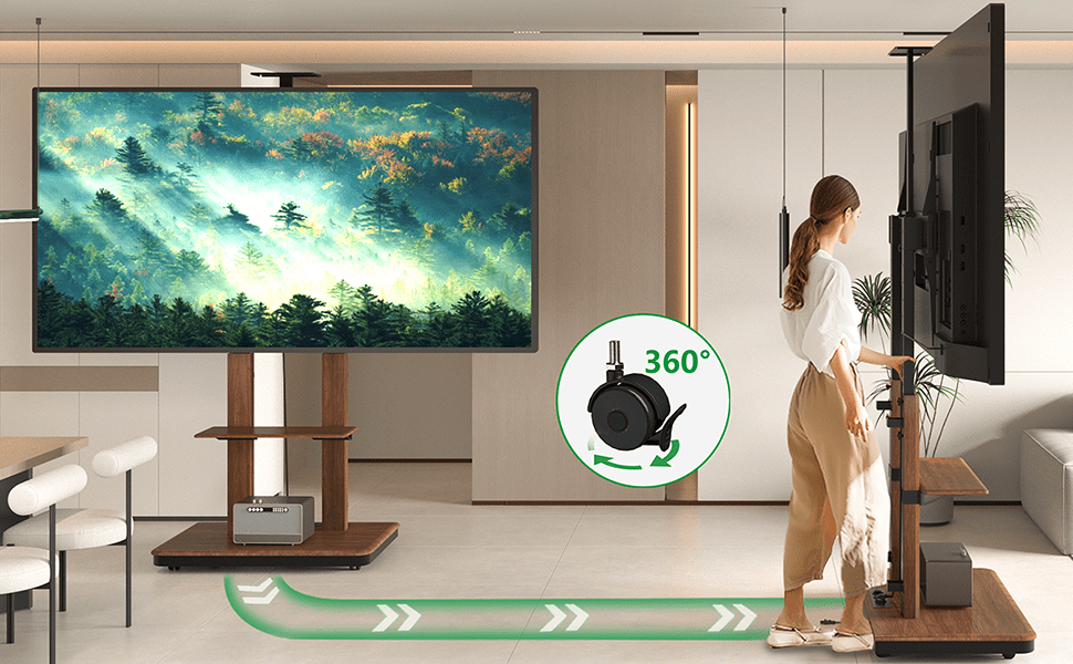 - Volledig mobiel: Dankzij de 4 soepele zwenkwielen (2 met rem) verplaats je zelfs de grootste schermen moeiteloos tussen verschillende ruimtes.