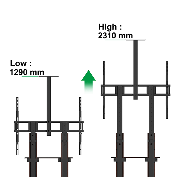 - Ergonomische hoogte: De tv is handmatig in hoogte verstelbaar (104 - 156 cm), waardoor je altijd de ideale kijkhoogte instelt voor zittend of staand publiek.