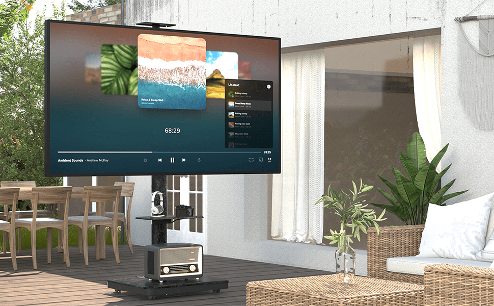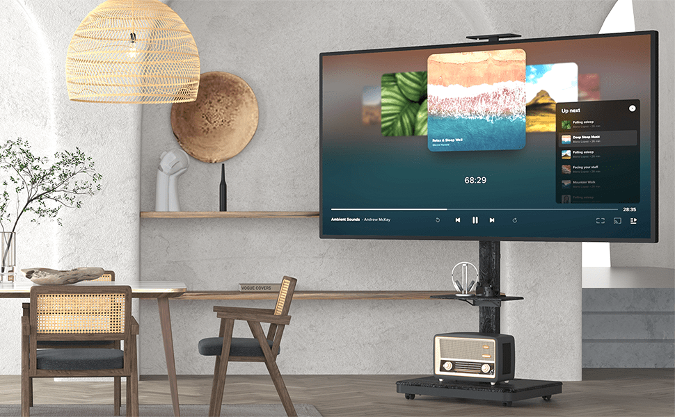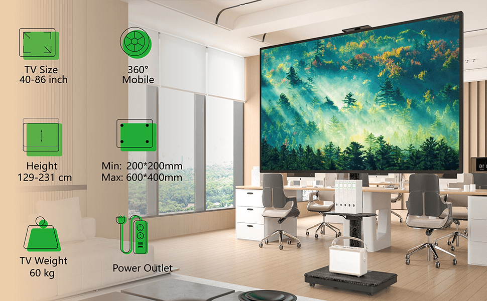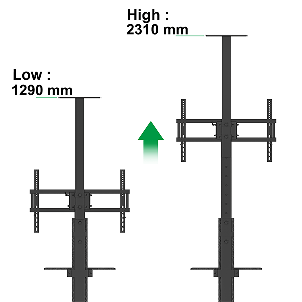 • Flexibele hoogte: Pas de kijkhoogte handmatig aan tussen 104 en 156 cm om de tv perfect af te stemmen op de ooghoogte van je publiek.