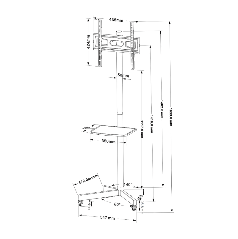 - Praktische apparatuurplank: Inclusief een plateau van 350 mm x 200 mm, ideaal voor het plaatsen van een laptop, mediaplayer of andere audio- en videoapparatuur.