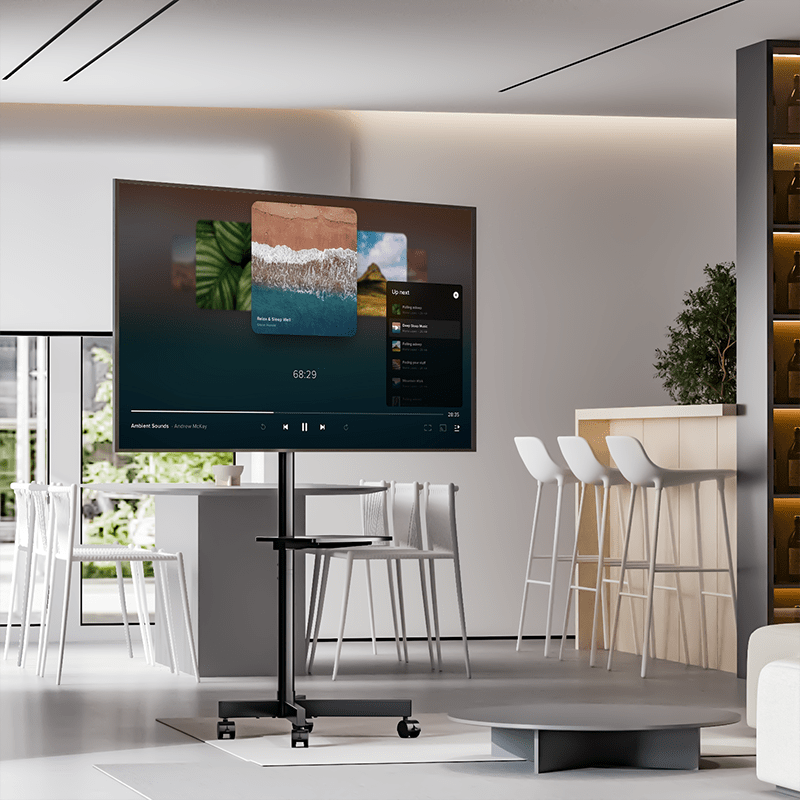 Professionele presentatie met de DQ TV standaard Nyna verrijdbaar zwart