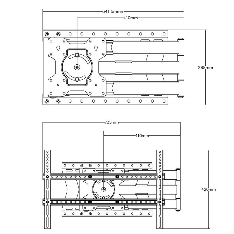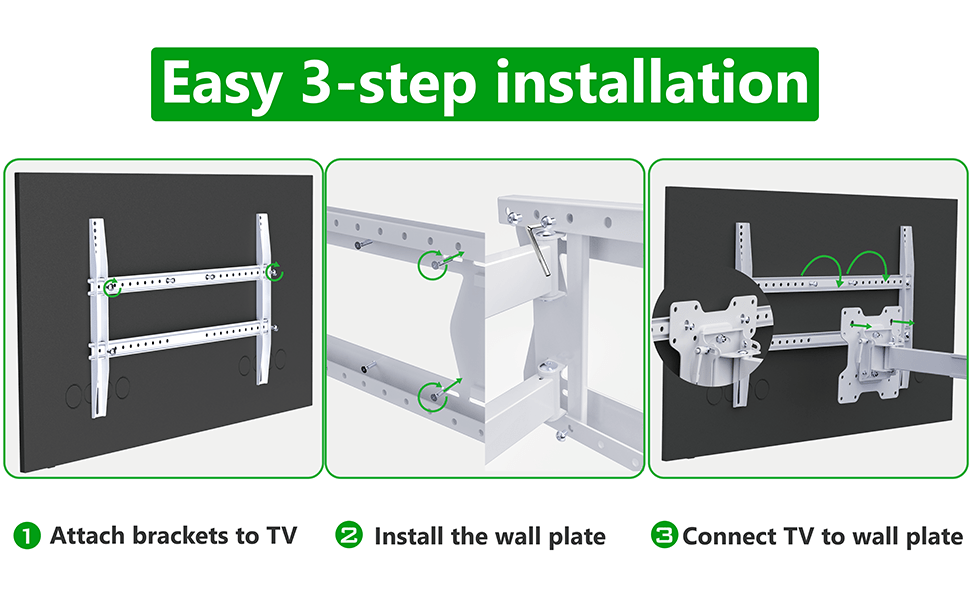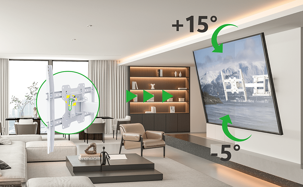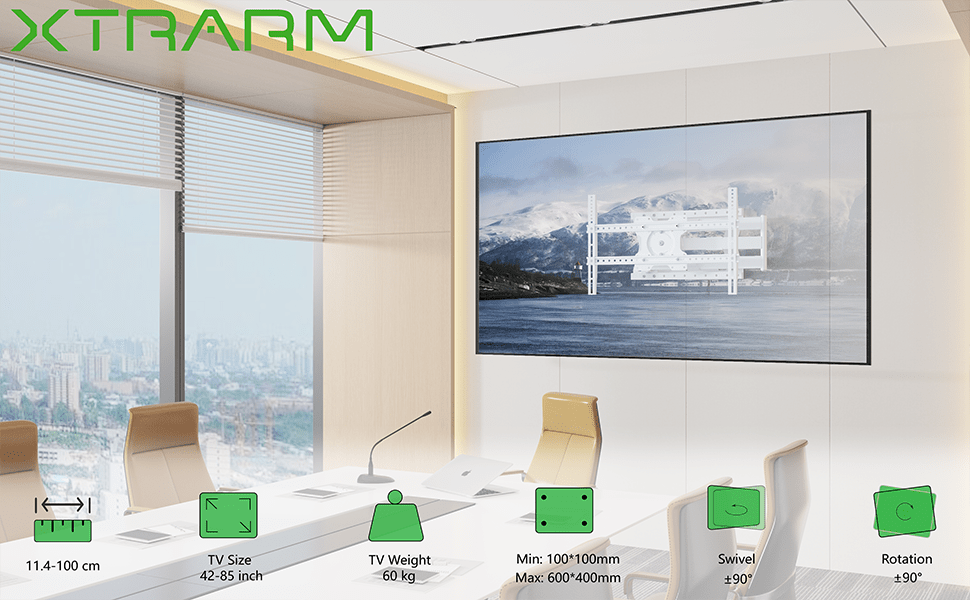 - Extreem lange arm: Met een variabele afstand van 11,4 tot 100 cm tot de muur biedt deze beugel unieke plaatsingsmogelijkheden voor zeer brede schermen.
